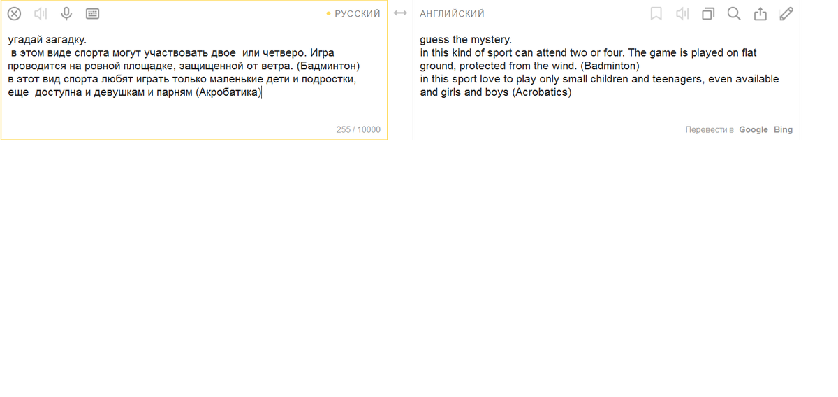 Напишите загадку на английском или как рассказик на 1-2 предложения про вид спорта.Надо 2 загадки