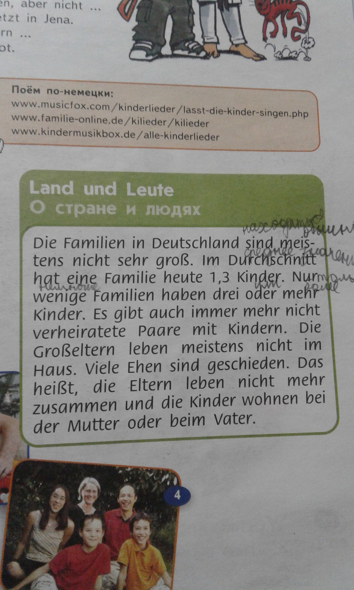 Семьи в Германии небольшие. В среднем в семье 1,3 ребенка. Все меньше семей имеют 3 или больше ребенка. Появляется все больше пар, которые не женаты и у которых есть дети. Бабушки и дедушки обычно живут отдельно. Очень много разводов. Это означает, что родители не живут вместе и ребенок остается с одним из родителей, мамой или папой.