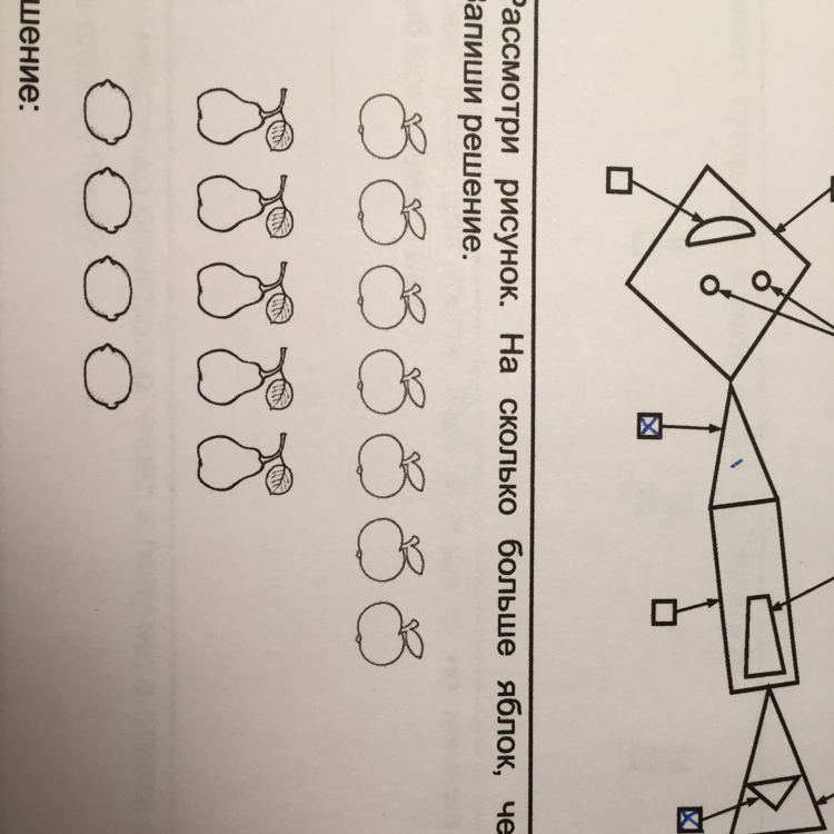 Посчитаем яблоки, их 7. Посчитаем груши, их 5. 7-5=2 (яб.) Ответ: на 2 яблок больше, чем груш.
