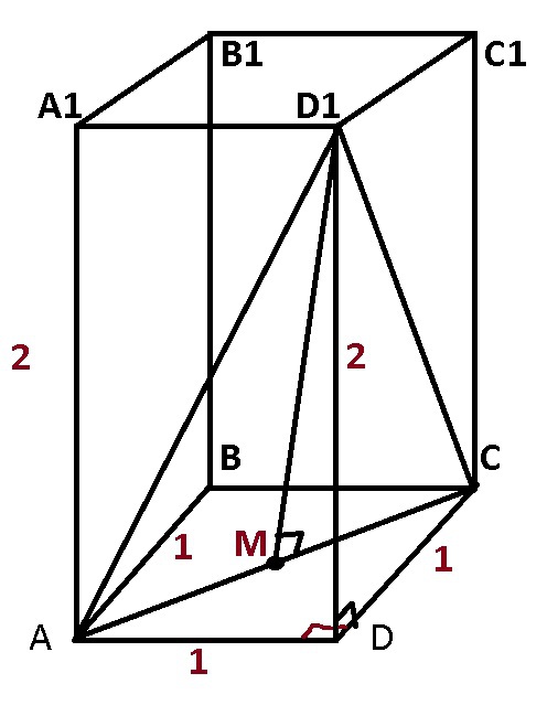 Дан прямоугольный параллелепипед ABCDA1B1C1D1. AB = 1, AD = 1, AA1 = 2. Найдите расстояние от точки D1 до прямой AC.