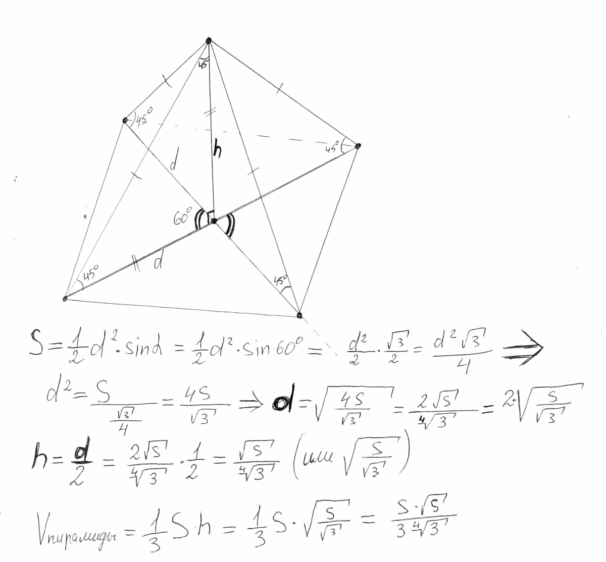 в основании пирамиды лежит прямоугольник, площадь которого равна S;боковые ребра пирамиды равны и образуют с плоскостью основания угол 45 градусов. угол между диагоналями основания равен 60 градусов. найдите объем пирамиды!