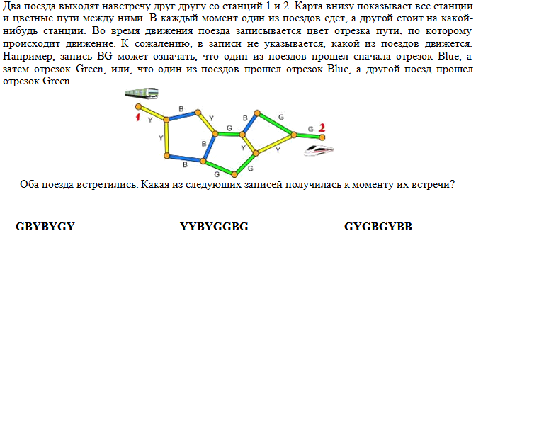 15. Два поезда выходят навстречу друг другу со станций 1 и 2. Карта внизу показывает все станции и цветные пути между ними. В каждый момент один из поездов едет, а другой стоит на какой-нибудь станции. Во время движения поезда записывается цвет отрезка пути, по которому происходит движение. К сожалению, в записи не указывается, какой из поездов движется. Например, запись BG может означать, что один из поездов прошел сначала отрезок Blue, а затем отрезок Green, или, что один из поездов прошел отрезок Blue, а другой поезд прошел отрезок Green.