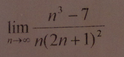 limlimits_ndfrac{n^3-7}{n(2n+1)^2}=limdfrac{1-frac7{n^3}}{(2+frac1n)^2}=dfrac14