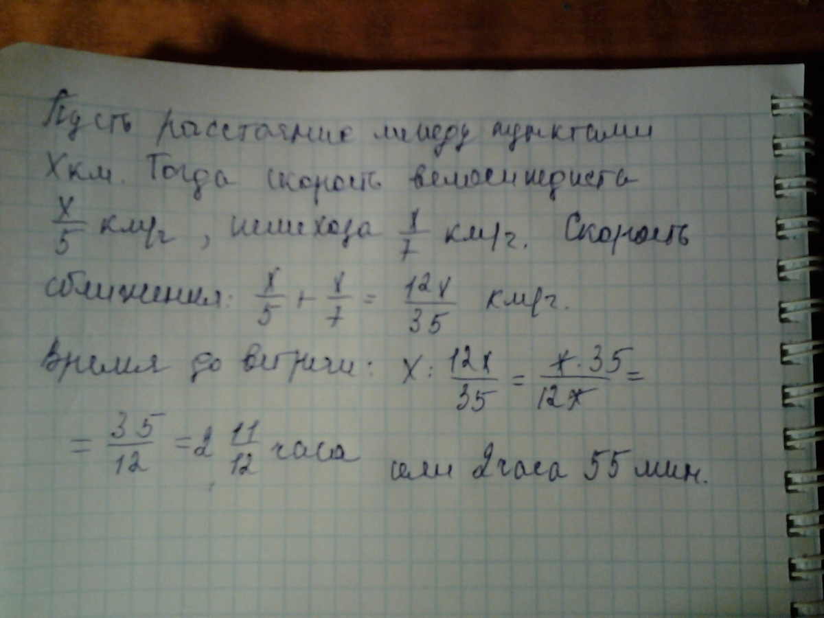 растояние между двумя пунктами велосипедист проезжает за 5 часов а пешеход проходит за 7 часов через какое время они встретятся если отправятся одновременно из этих пунктов навстресу друг другу