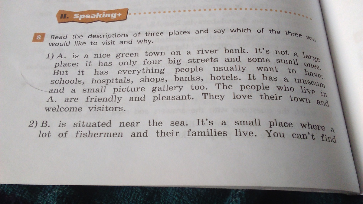 1.A прекрасный зеленый город на берегу реки.Это небольшое место:он имеет только 4 большие улицы и несколько маленьких.Но у него есть все что люди обычно хотят:школы,больницы,магазины,банки,отели.Тут есть музей и также маленькая картинная галерея.Люди которые живут в A. Дружелюбные и довольные.Они любят их город и рады посетителям.