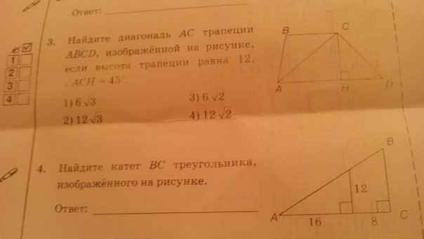 3) Найдите диагональ AC трапеции ABCD, изображённой на рисунке, если высота трапеции равна 12, угол ACH равен 45 градусов.