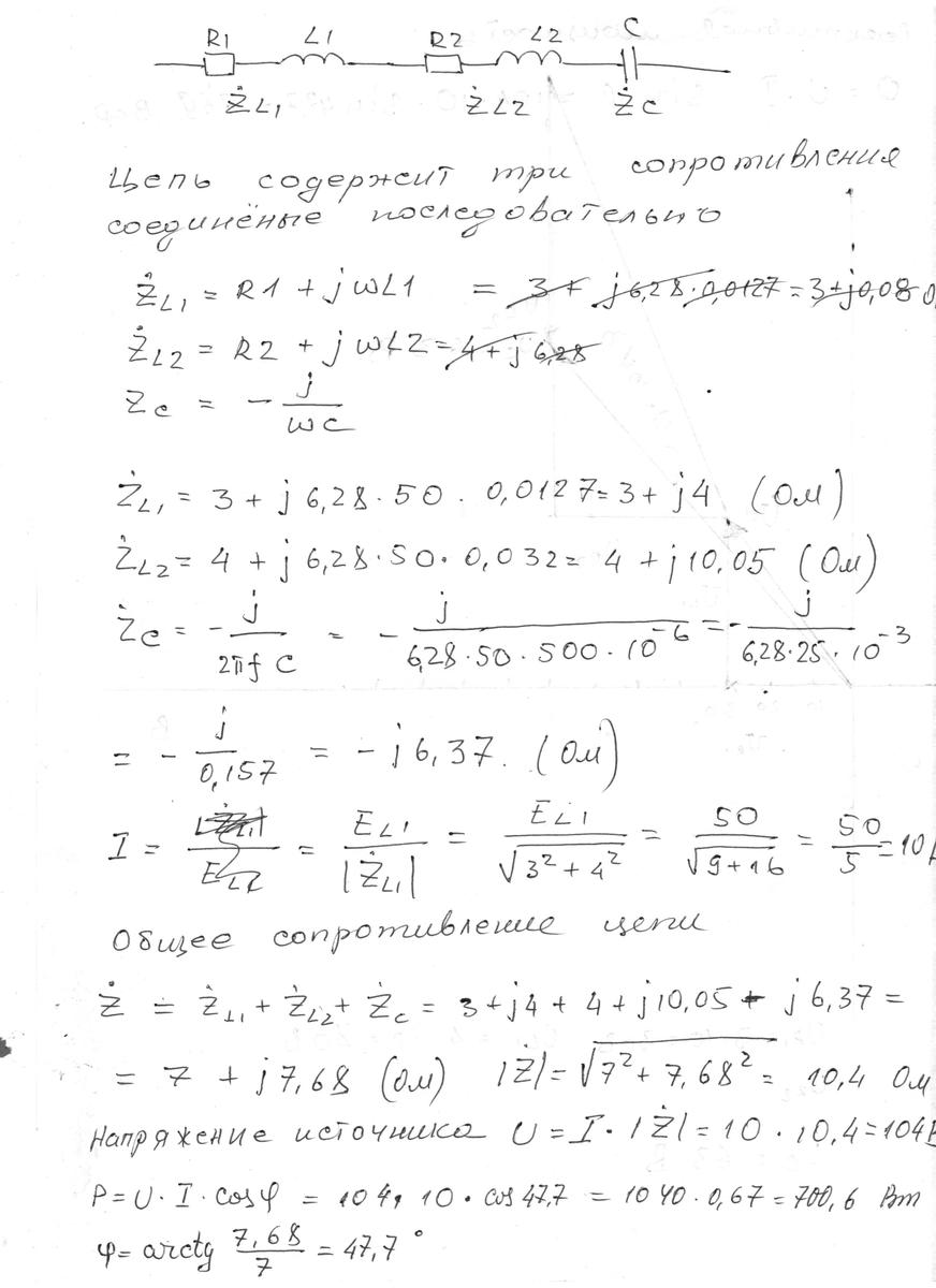 В емкость синусоидального переменного тока (рис. 5) включены последовательно две катушки и емкость. Параметры катушек и емкости известны: r1, L1, r2, L2