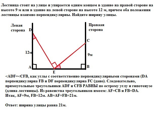 Обозначим концы лестницы буквами Е и С когда она прислонена к стене на правой стороне улицы, а буквами Е и D - когда прислонена к стене на левой стороне.