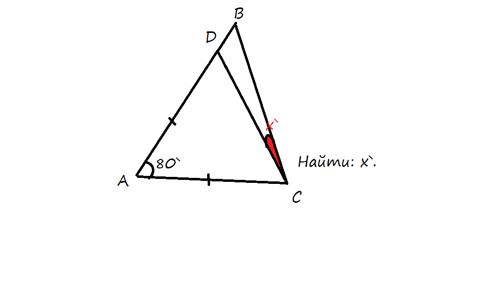 Помогите решить. Треугл. ADC равно бедренный. Угл. BAC = 80` найти: угл. x