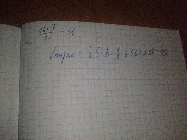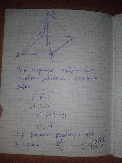 диаг. = 2*корень(8*8 + 6*6) = 4*корень(7). Сторона квадрата а=корень((16/2)*7)= корень(56), подставляя полученные значения в формулу, получаем объем пирамиды: (корень56)2*(1/3)*6 = 112.