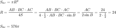 Даю много баллов. Найдите площадь круга, ограниченного окружностью, описанной около треугольника ABC, у которого угол В = 30°, АС=24 см