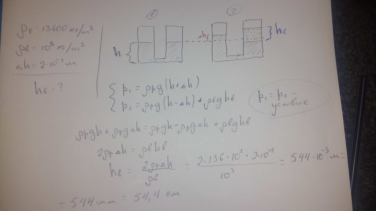 в сообщающихся сосудах находится ртуть в одно из колен доливается вода,какой высоты должен быть столб воды,что бы уровень ртути в другом колене поднялся на 2 см?