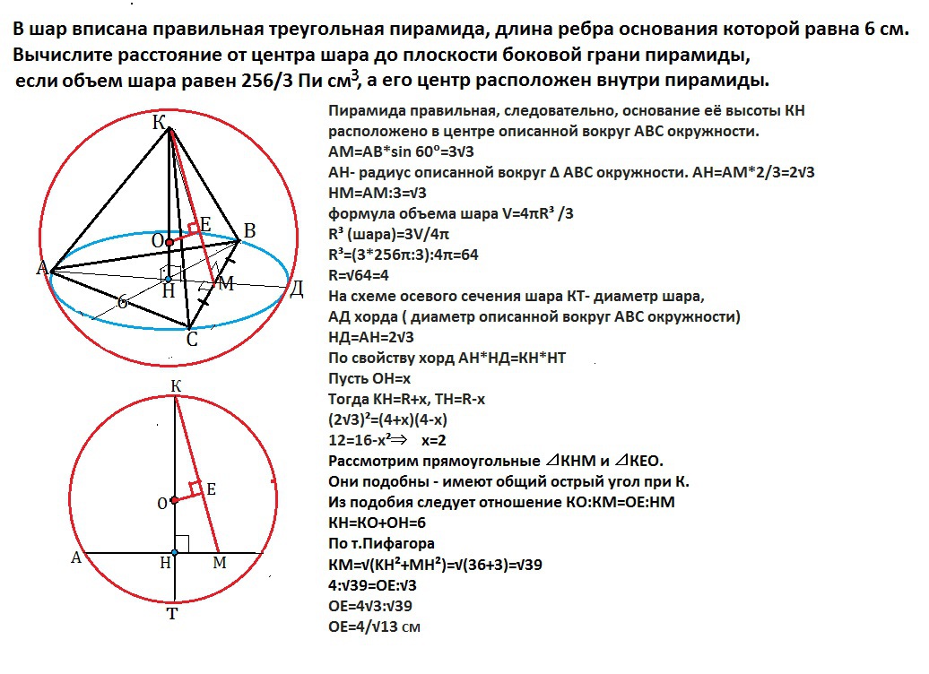 В шар вписана правильная треугольная пирамида, длина ребра основания которой равна 6 см.Вычислите расстояние от центра шара до плоскости боковой грани пирамида, если объем шара равен 256/3Пи см^3, а его центр расположен внутри пирамиды