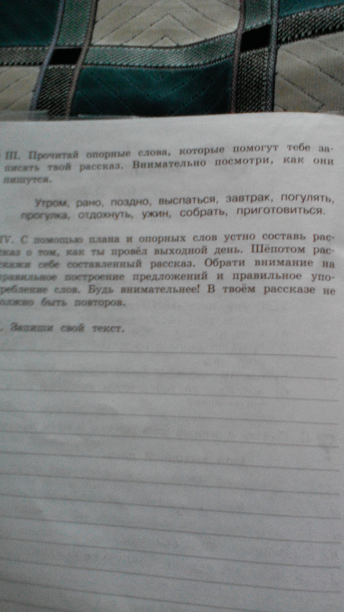 Сегодня рано утром я проснулся, позавтракал и пошёл в школу. У нас была математика, английский, русский. За сегодня я очень устал(а). я долго делала уроки, поздно легла спать