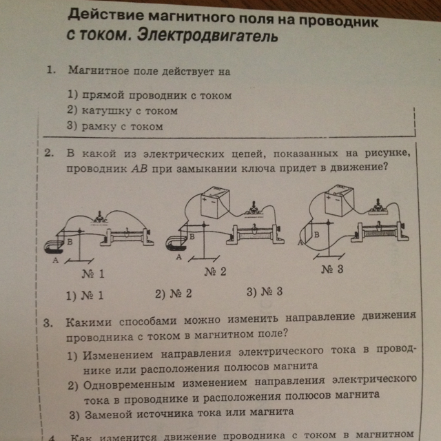 1. На проводник с током, на рамку с током (1 и 3)