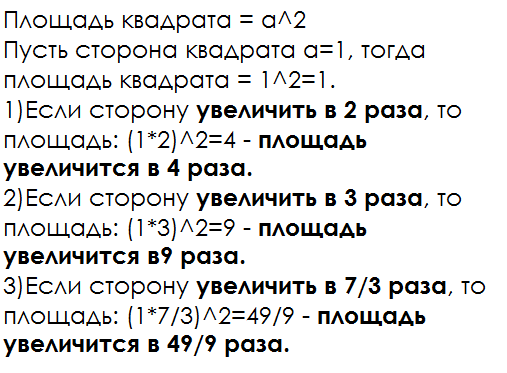 как изменится площадь квадрата если его сторону увеличить в 2 раза? в 3 раза?в 2 целых одна третья раза? помогите пожалуйста