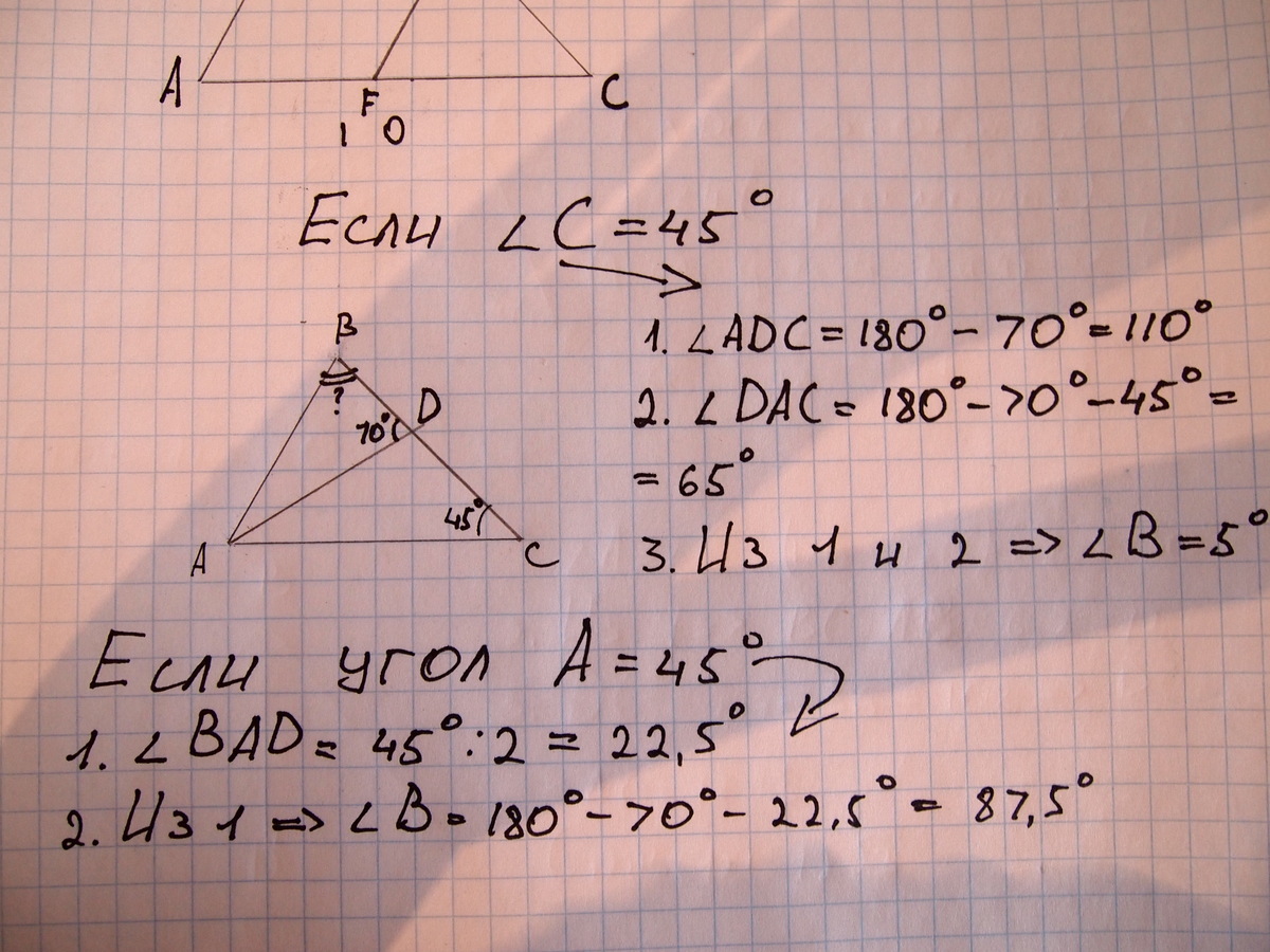 В треугольнике АВС угол равен 45 градусов,АD-биссектриса угла А,угол АDВ равен 70 градусов.Найдите градусную меру угла В.