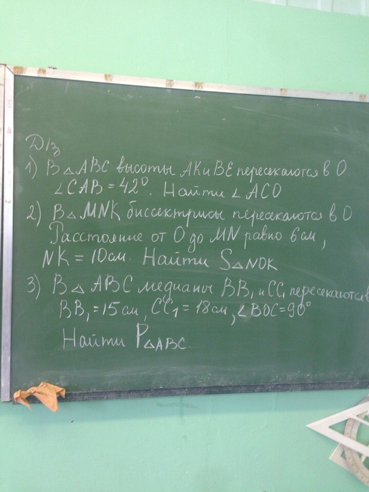 Построй треугольник , обозначь ABC и проведи перпендикуляр через угол A, к стороне BC, так же из вершины B проведи высоту на сторону AC. и место пересечения обозначь C. Треугольник ABC подобен треугольнику AOC. Если угол CAB=42,то можно разделить его на 2 равные части по 21 градус. И теперь мы узнали что угол KAC равен 21 градус и угол BAK тоже равен 21 градус.