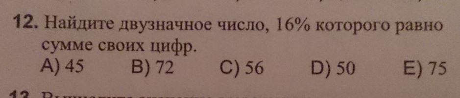 12. Двузначное число х состоящее из цифр а и в, где а - число десятков, в - число единиц, представим как х=10а+в. 16% от х - это 0,16х, по условию 0,16х=а+в, тогда: