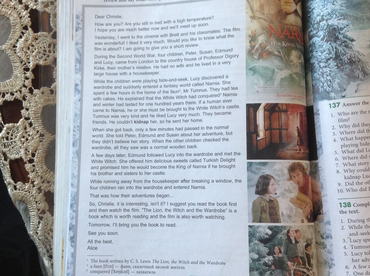 The lion, the Witch and the wardrobe. It tells the story of four ordinary children (Peter, Susan, Edmund and Lucy) . They discover a wardrobe in Professor Kirke's house that leads to the magical land of Narnia, which is under the spell of the evil White Witch. Four children fulfill an ancient prophecy with the help of Aslan and the good denizens of Narnia free Narnia from the White Witch, together with the overthrow of the White Witch in Narnia ends a Long Winter that lasted 100 years.