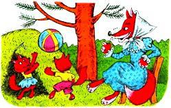Был чудстный летний денёк! Лиса с лисятами вышли из норы,погулять у вевистой сосны. Малыши начали играть в мячик. Мама Лисица следит за лисятами.