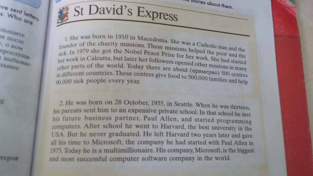 она родилась в 1910 году Македония. Она была католической монахиней основатель благотворительных миссий. миссии помогал бедным и больным. 1979 она получила Нобелевскую премию мира за свою работу. У нее была позже ее последователи открыли другие миссии во многих других пар в мире сегодня насчитывается около S00 в разных странах. Эти центры дают пищу 500000 семей и Хель 90000 больных людей каждый год. 2. Он родился 28 октября 1955 года в Сиэтле. Когда ему было тринадцать лет, родители отправили его в дорогой частной школе. В том, что его деловой партнер Пол Аллен, и начал программировать компьютеры. После школы он поступил в Гарвард, лучший университет в США. Но он никогда не закончил. Через два года он покинул Гарвард и отдал все свое время Microsoft, компании, которую он начал с Полом Алленом в 1975 году, сегодня он мультимиллионер. Его компания, Microsoft, является самым большим и самым успешным компьютерная программа компании в мире.