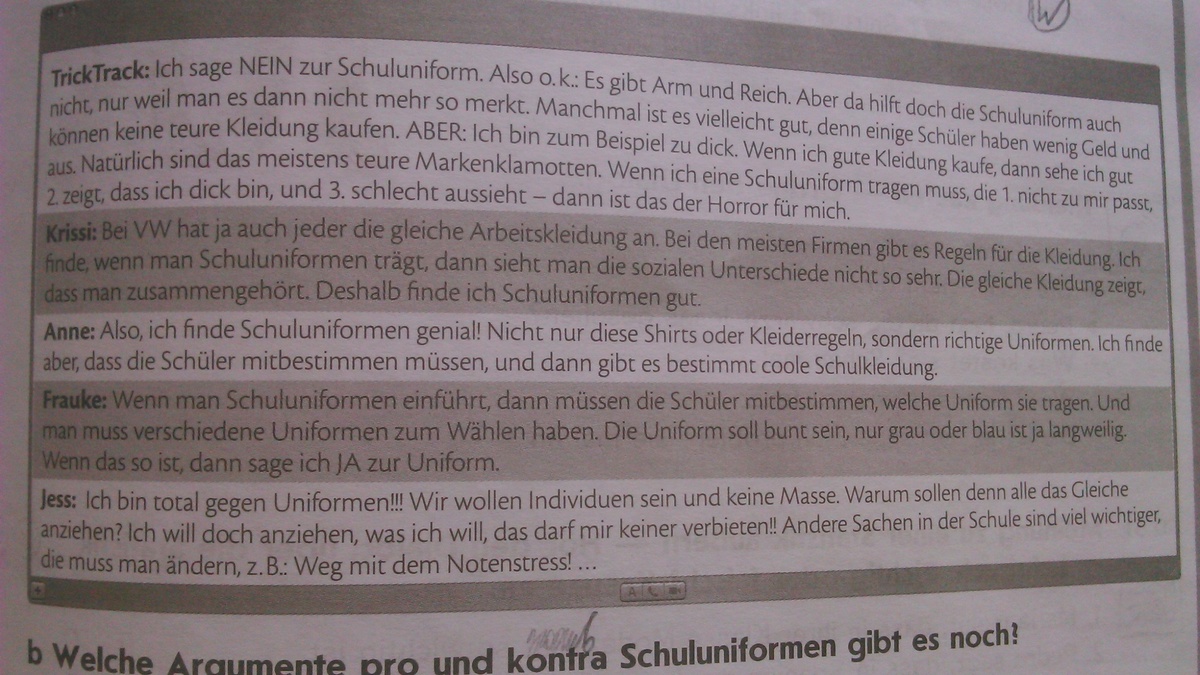 Фрауке: Если вдруг введут школьную форму,школьники должны определиться,какую униформу они хотят носить. Также должен быть выбор между разными униформами. Униформа должна быть яркой,поскольку серая или голубая будет скучной. Если так будет,я скажу "да" школьной форме.