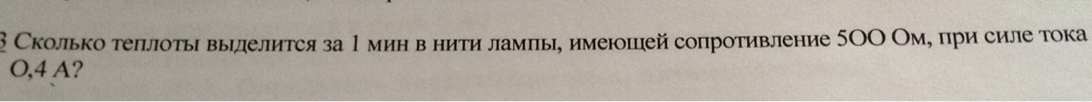 ХЕЕЕЛП! ЛЮДИ!! Сколько теплоты выделится за 1 мин в нити лампы, имеющей сопротивление 500 Ом, при силе тока 0,4 А? Дать полный ответ.