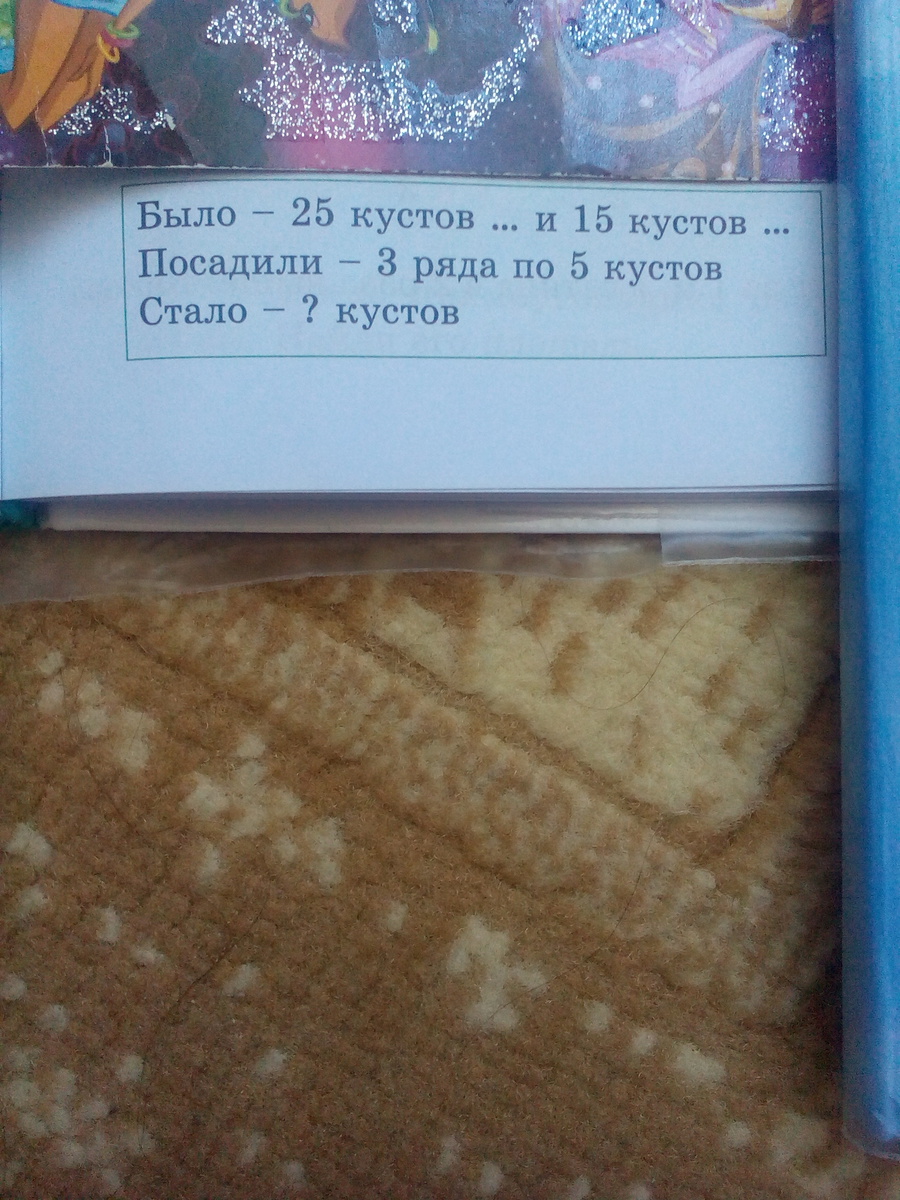1) 25+15= всего 40 кустов было 2) 3×5=15 кустов посадили 3)40-15=25 кустов стало
