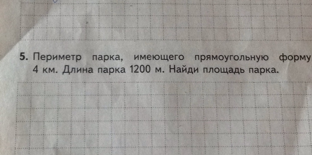 5. Периметр парка имеющего прямоугольную форму 4 км Длина парка 1200 Найди площадь парка