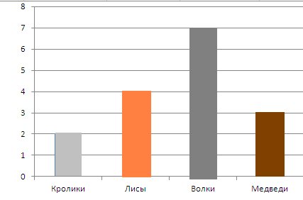 в зоопарке на площадке молодняка играли 2 белых кролика 4 лисы 7 волчат и 3 медвежонка. Нарисуй диаграмму зверей играющих на площадке. Расскрась столбики тем же цветом что и цвет шерсти зверей