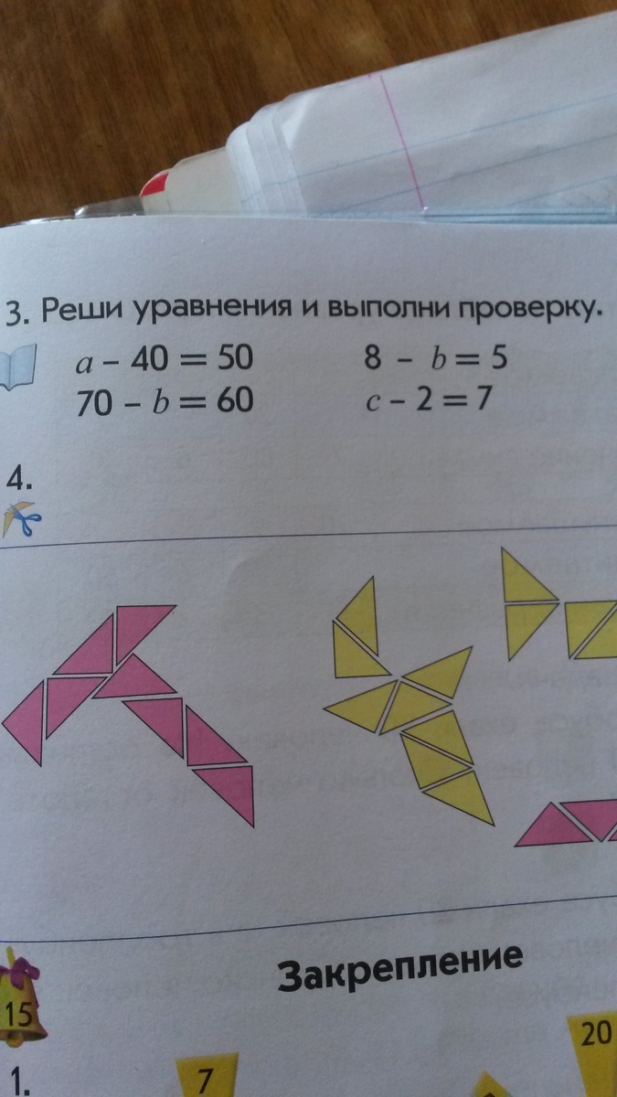 а - 40 = 50. а = 40 + 50. а = 90. 90 - 40 = 50. Ответ: 90. 70 - b =60. b = 70 - 60. b = 10. 70 - 10 = 60. Ответ: 10. 8 - b = 5. b = 8 - 5. b = 3. 8 - 3 = 5. Ответ: 3. c - 2 = 7. c = 7 + 2. c = 9. 9 - 2 = 7. Ответ: 9.