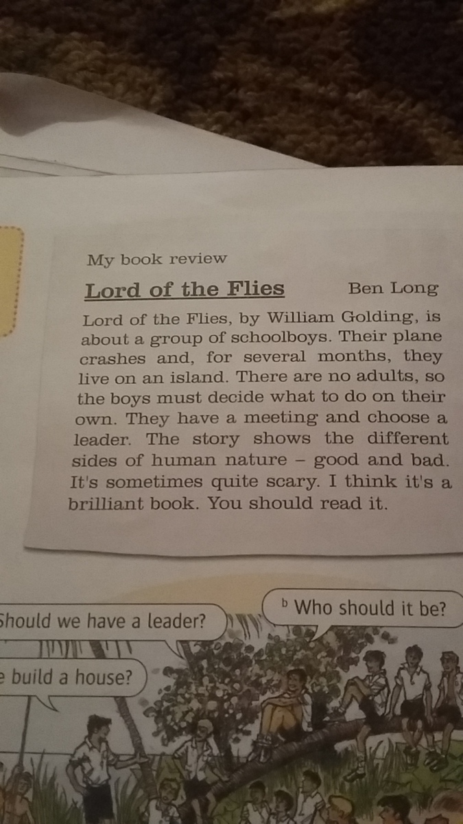 Повелитель мух Вильям Голдинг, о группе школьников. Их самолёт падает и, в течении нескольких месяцев, они живут на острове. Там нет взрослых, поэтому мальчики должны решить что делать, самостоятельно. У них собрание выбрать лидера. История показывает разные стороны природы- хорошего человека и плохого. Это иногда довольно страшно. Я думаю, что это блестящая книга. Вы должны прочитать это.