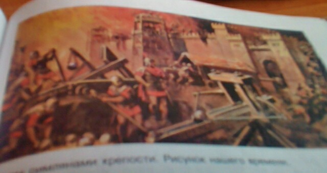 опишите рисунок штурм крепости . как выглядели метательные машины , таран , башня на колесах , штурмовые лестницы ?
