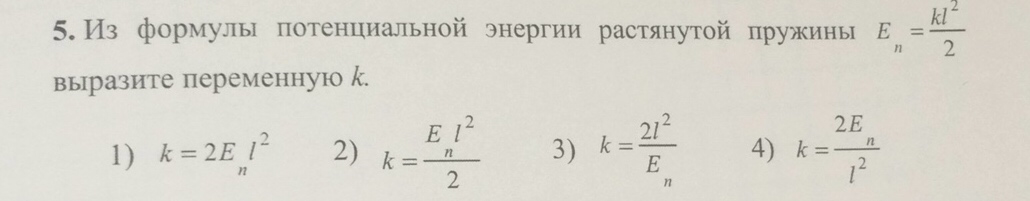 5. Из формулы потенциальной энергии растянутой пружины Е п 2 выразите переменную 2 2 2 Е 1 21 1 2 ‚ п 1) „ ) 3) 4) [1