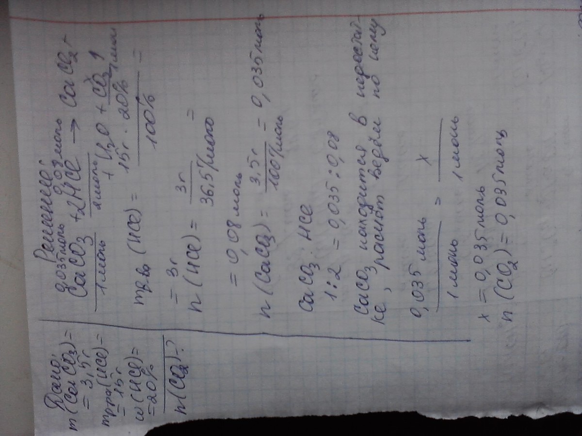 вычислите количество вещества CO2, который можно получить при взаимодействии CaCO3 m=3,5 г с раствором HCl m=15г ω=20%