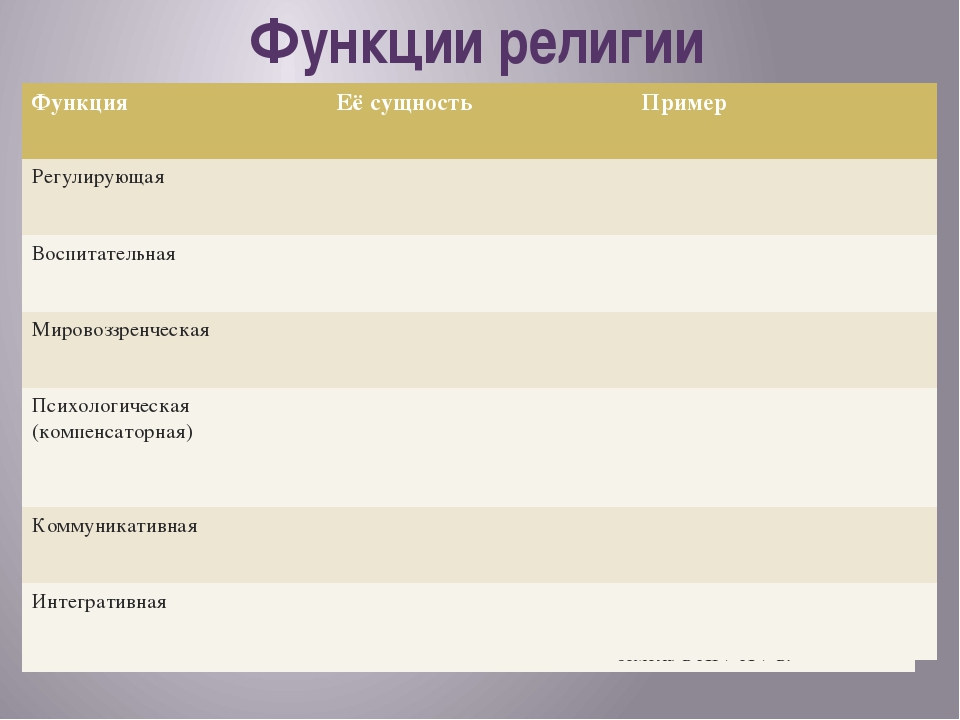 3. Мировоззренческая - задаёт критерии, абсолюты, с точки зрения которых осмысливается мир, общество, человек (понятие "ада" и "рая", ответы на вопросы "есть ли жизнь посмле смерти?", толкования устройства и создания мира)