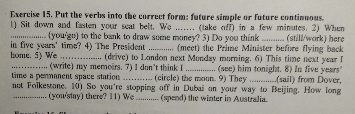 1.will take off 2.will you go 3.will you still be working 4.will meet 5.will e driving 6.will be writing 7.will see 8.will be circling 9.will be sailing 10.will you be staying 11.will be spending
