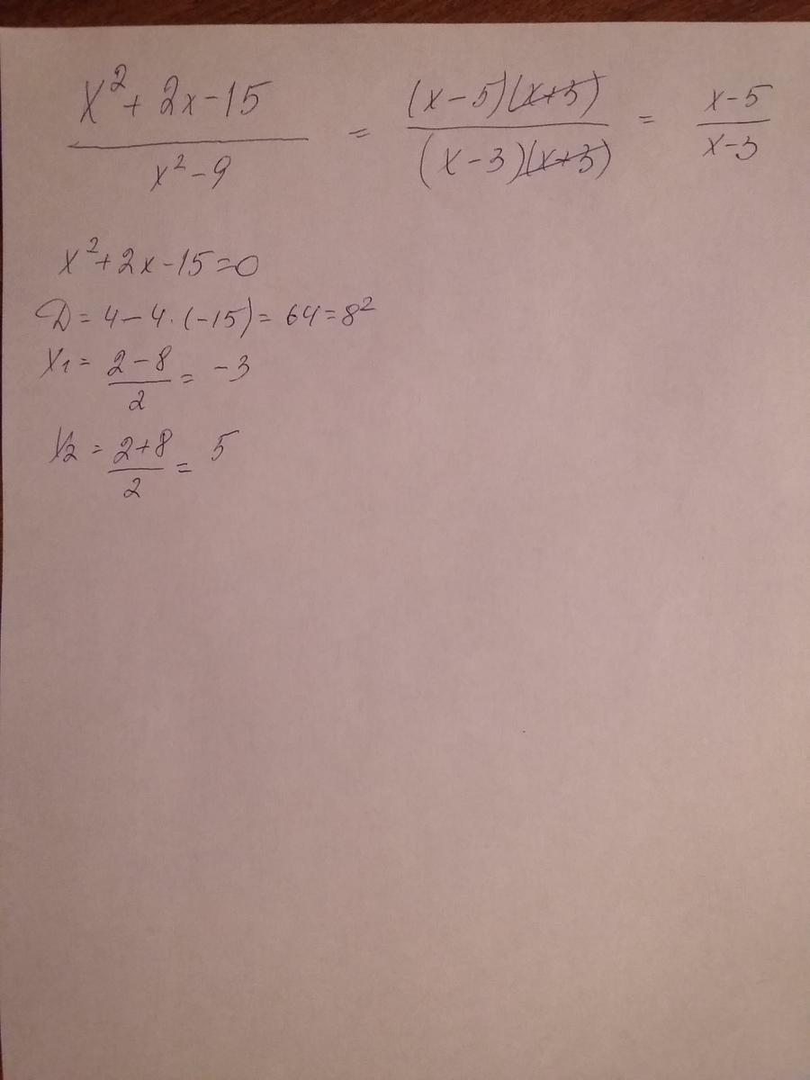 (x^2 + 2x - 15) / x^2 - 9 = ( x - 3)(x + 5) / ( x - 3)(x + 3)= (x + 5)/ (x + 3)