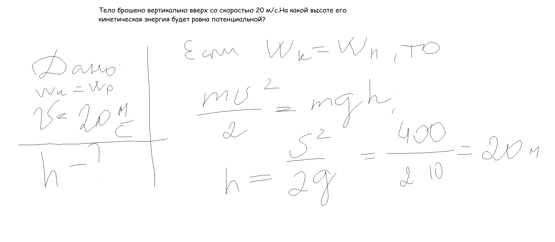 Тело брошено вертикально вверх со скоростью 20 м/с.На какой высоте его кинетическая энергия будет равна потенциальной?