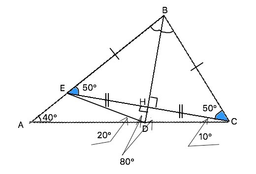 В треугольника ABC угол A равен 40 градусам, угол C равен 60 градусам, BD-биссектриса, E-такая точка на AB, что BE=BC. Найдите угол ADE.