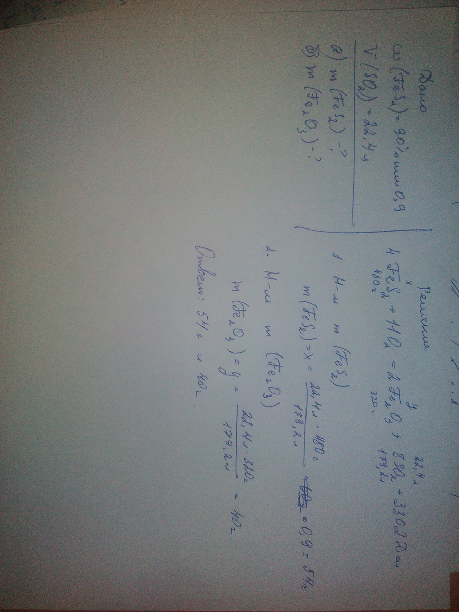 При обжиге минерала пирита, содержащего 90% FeS2 получено 22, 4 л оксида серы (IV). Определите: а) массу израсходованного пирита б) массу образовавшегося оксида (III)