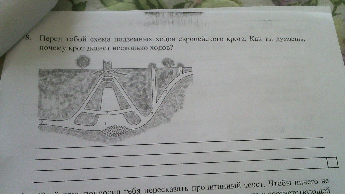 Крот всю свою жизнь проводит в подземных ходах, которые сам и роет. Ходы эти делятся на кормовые и жилые. Кормовые - это такие ходы, как будто ловушки - в них попадают из других слоёв почвы черви, насекомые, их личинки. А вот по жилым ходам крот передвигается. Там есть и вода, и гнездо, и ходы к кормовым ходам. Спит крот на глубине около 2 метров - это один из самых глубоких ходов - своё гнездо крот прячет в корнях деревьев. А вот кормовые ходы расположены почти на поверхности земли.