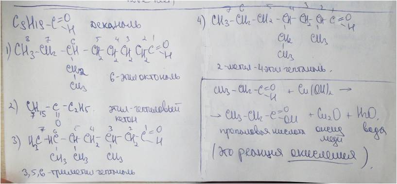 Спасите! 1.написать 4 изомера для альдегида,имеющего формулу C9H19-C=(Вверх)-H(вниз). Дать название веществам.
