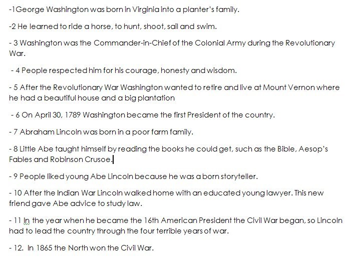 1.Where was George Washington born? 2.What things did he learn to do when he was a boy? 3.What did George Washington do during the Revolutionary War?4.Why did people respect him?5.What did Washington want to do after the Revolutionary War?6.When did George Washington become the first president of the country?7.In what kind of family was Abraham Lincoln born?8.How did Little Abe teach himself?9.Why did people like young Abe Lincoln?10.Who gave Lincoln an idea to become a lawyer?11.What was happening in the country at the time when Lincoln was President?12.What great event in the US history happened in 1865? Помогите ответить на вопросы...