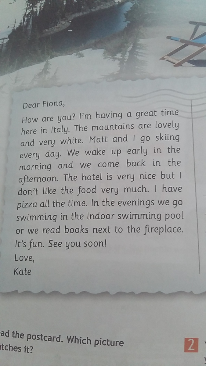 Как ты?Я провела хорошо время в Италии.Горы там были очень белые и красивые.Мэт и я ходили кататься на лыжах каждый день.Мы вставали рано утром и прикопили вечером.Отель был очень хороший но мне не понравилась еда.Поэтому всегда я ела пиццу.Вечерами мы ходили на уличный бассейн и купались там или мы читали к ними про пожары.