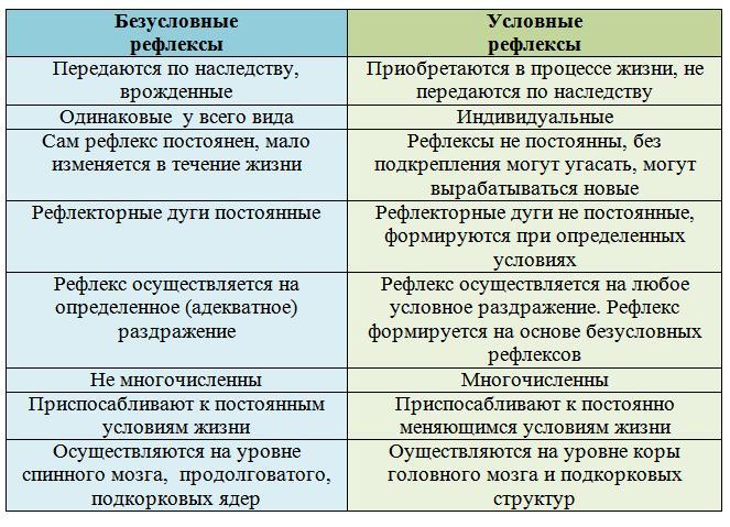 Таблица сравнения условных и безусловных рефлексов во вложении.