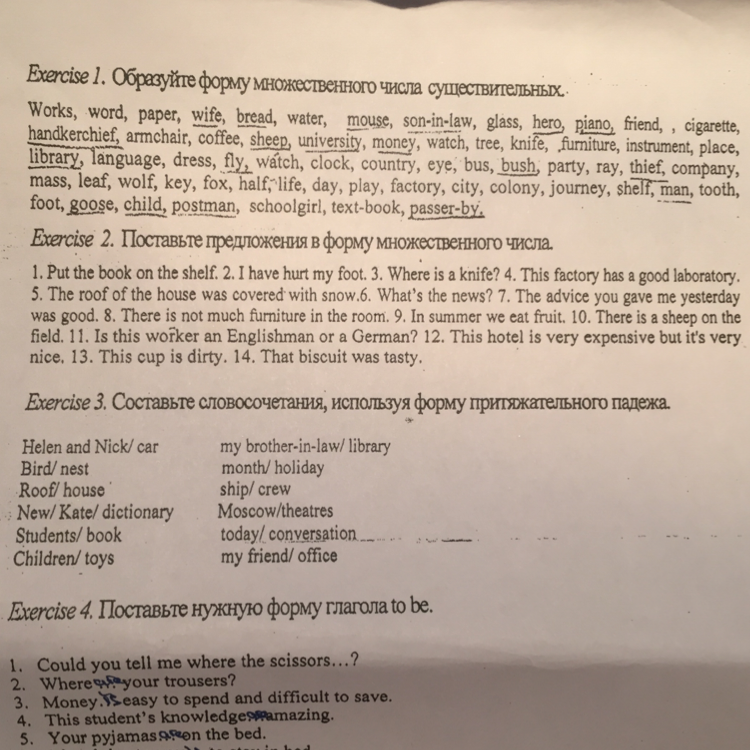 2. 1the books; 2feet; 3the knives; 4laboratories; 5the roofs of the houses WERE covered...; 6news всегда пишется с S на конце, но всегда в ед.числе(The news IS good); 7advices...WERE good; 8furniture всегда в единственном; 9fruit всегда в единственном; 10There're sheep...; 11Are there workers Englishmen or Germans?;12There hotels are... but they're very nice; 13These cups are dirty; 14Those biscits were tasty.