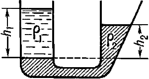 массы не равны, равно давление, которое они создают, а оно зависит от плотности и высоты столба жидкости; (ро1) меньше (ро2), поэтому столб левый больше, иначе равновесия не будет.