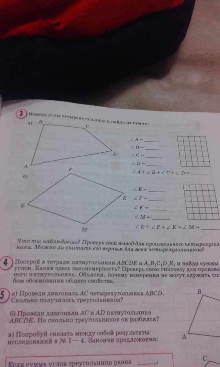 Надо взять транспортир (штука для измерения углов), измерить сколько градусов каждый угол, под какой буквой вершина угла на той строчке и писать потом сложи градусы всех углов.